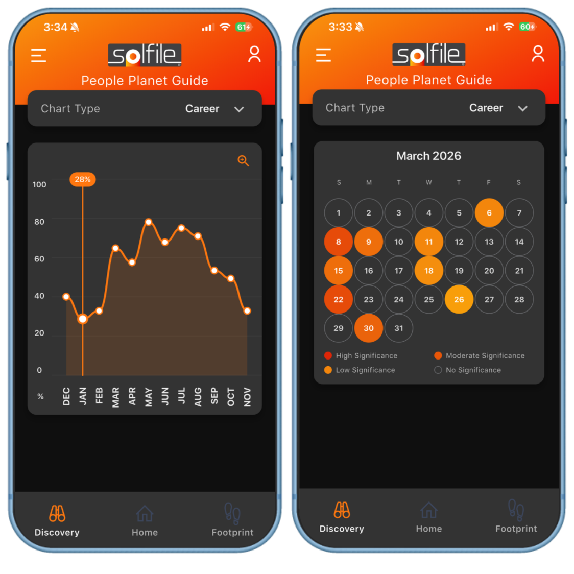 Ever felt like you’re just having a ‘down day’? We each have our own unique rhythm, which means we’re better suited to tackling certain challenges at certain times. By plotting your Performance Peaks, Solfile Discovery can map out the precise times that you’re best positioned to tackle specific tasks. We’ll also flag times when particular decisions are best avoided.