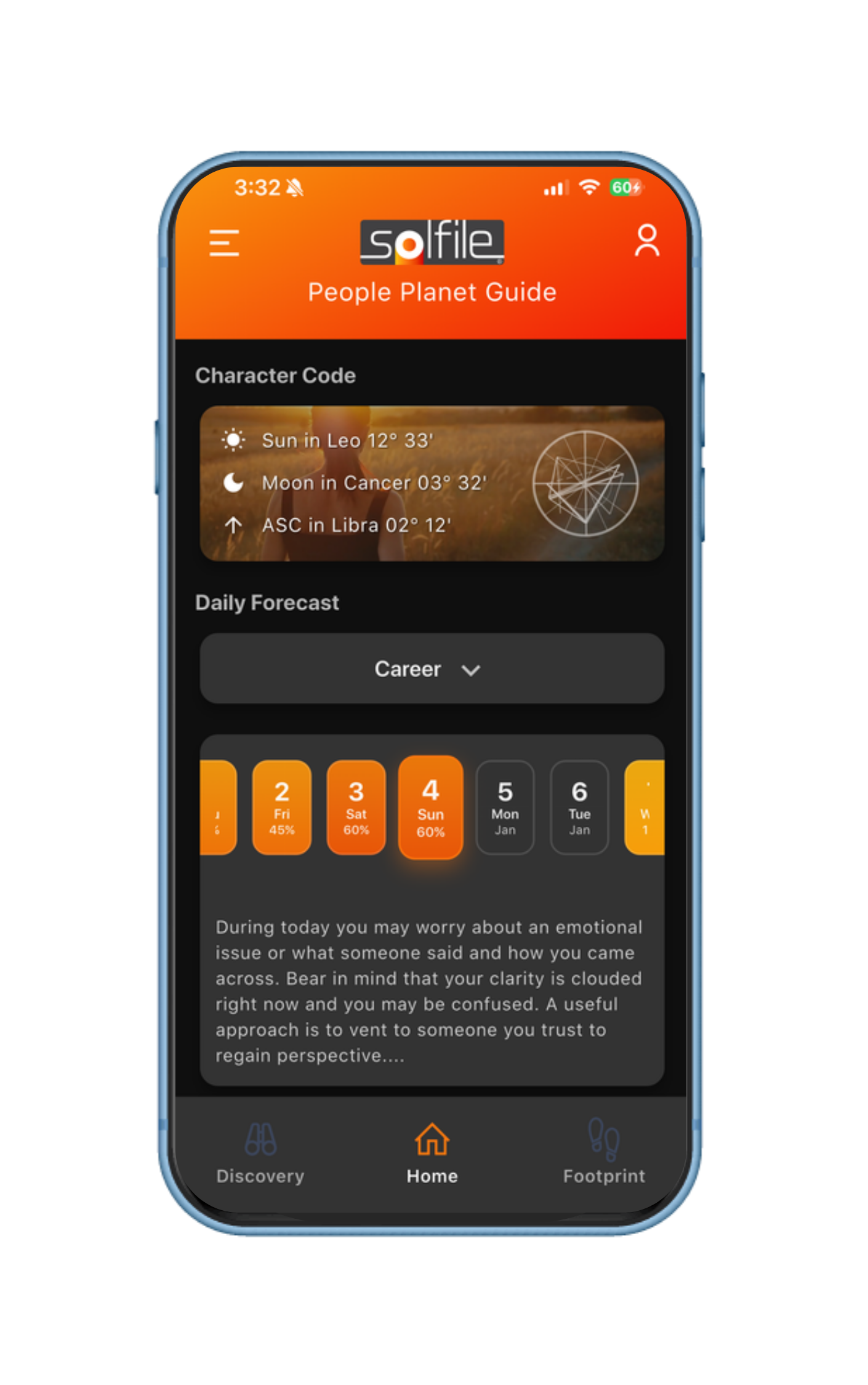 Combined with your astrological birth chart and global positioning technology, our precision algorithm makes each Solfile Footprint and Discovery insight completely unique to you.